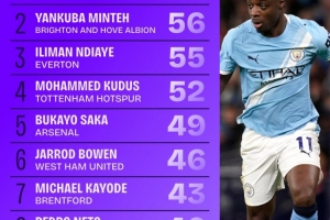 本赛季英超过人数排行:多库63次居首,萨卡49次第5