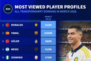 体育资讯4月3日讯 德国转会市场列出了3月份球员页面浏览量排名,C罗居首,亚马尔、居莱尔、梅西前四。