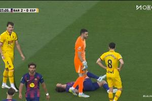比赛第37分钟,西班牙人的一次进攻,巴萨中卫马丁突然痛苦倒地。但随后他在队医的处理后看起来问题不大,回到了比赛。